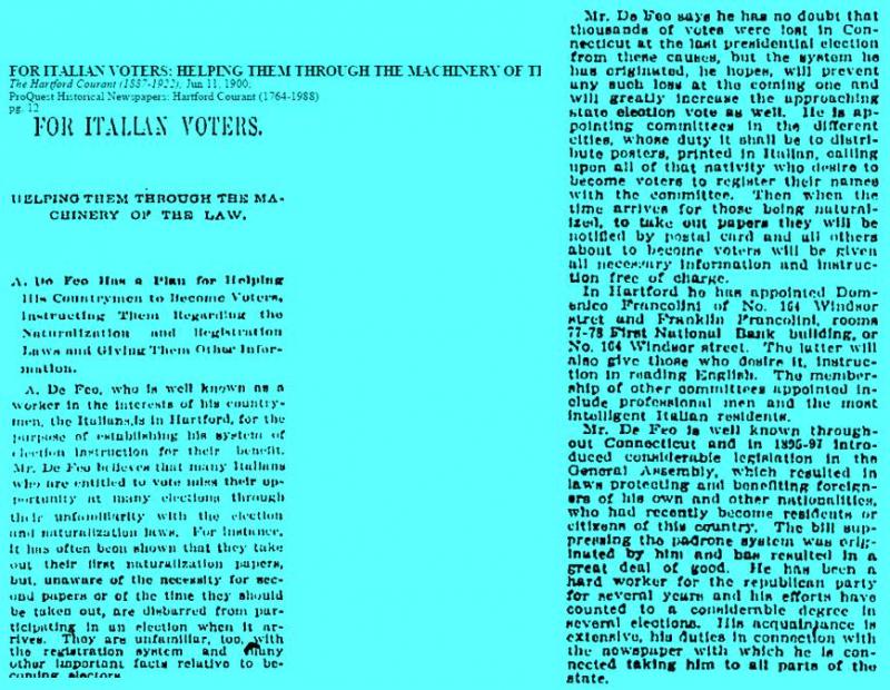 Mr De Feo apparently came to Hartford as the representative of a chain selling groceries to other stores. He stayed a few months but became very involved both with the Italian Republicans, of which he became chairman, as well as in fighting the Padrone system.