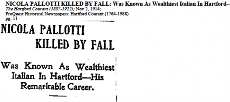 The Nicola Pallotti family was, according to a 1915 Courant article, the third Italian family to arrive in Hartford, the first two, always according to the same article, being the Garibaldi and Brancieri ( spelled Bracieri in the article). Nicola died in 1914 and was then the richest Italian in Hartford and one of its wealthiest overall. His son Francis became a well known judge