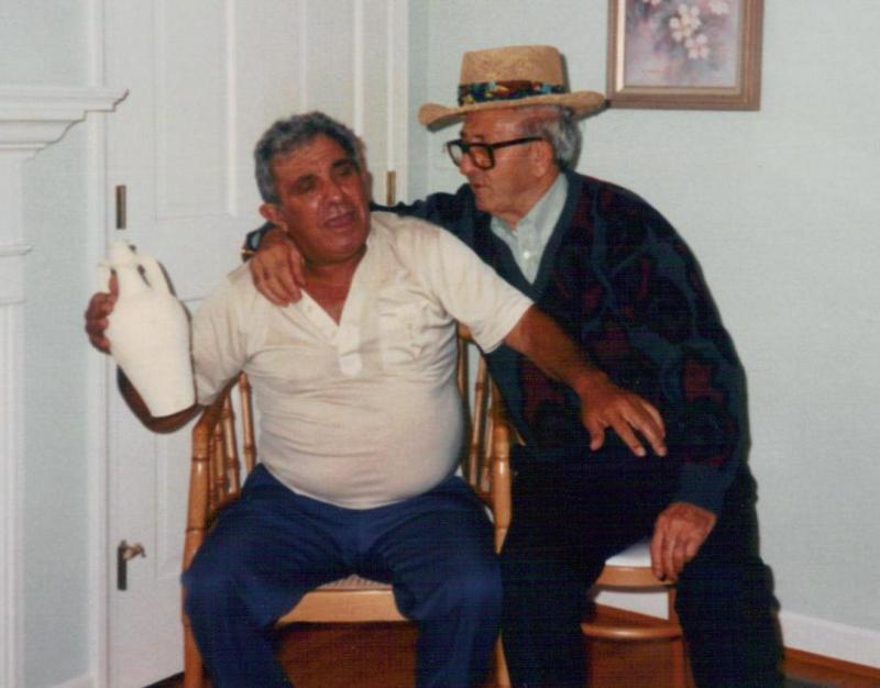 Uncle Joe and his cousin Paolo Ficara ( since deceased) joking around while over our house for dinner, mid 1990's. Joe e Paolo Ficara scherzono con la "quattara".