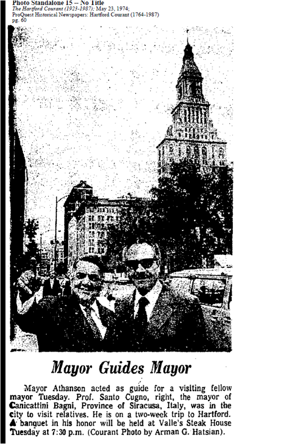 Ad accompagnare il primo cittadino di Hartford c’erano il consigliere John Bazzano, il senatore William Di Bella, i deputati Alphonso Marotta e Joe Mioli, il presidente del Sister City International, Brian Smith, ma anche illustri emigrati canicattinesi che nella capitale del Connecticut svolgono ruoli di primo piano, come l’imprenditore Salvatore Bordonaro e Paul Pirrotta, autorevole esponente del mondo finanziario e autore del libro “From Sicily to Connecticut – testimonianze dirette di emigrazione canicattinese”.
