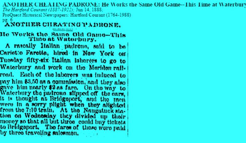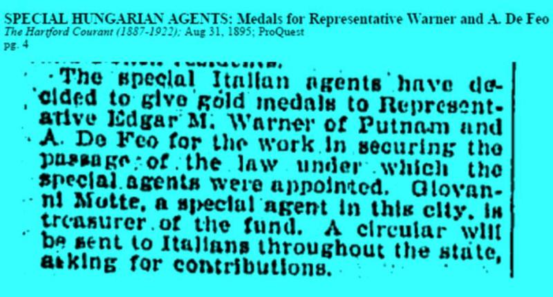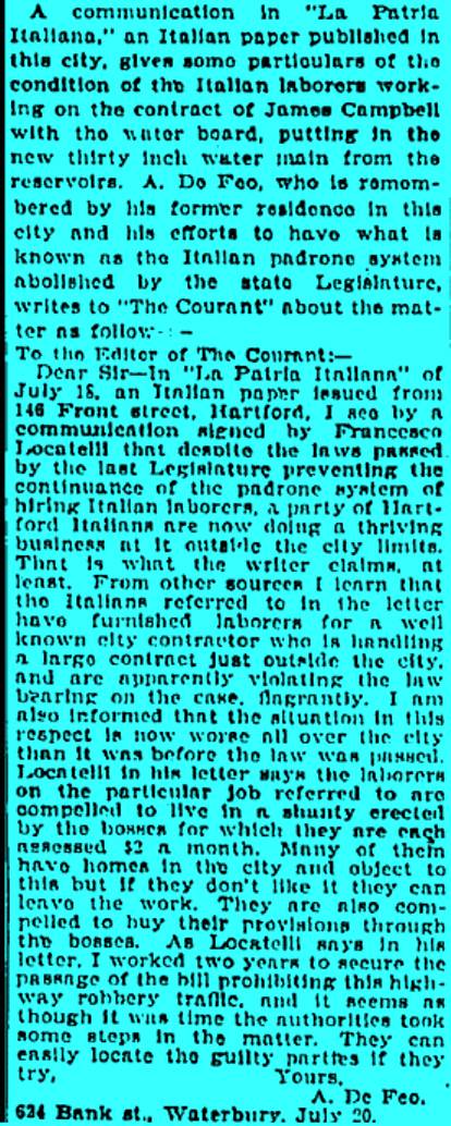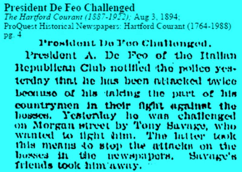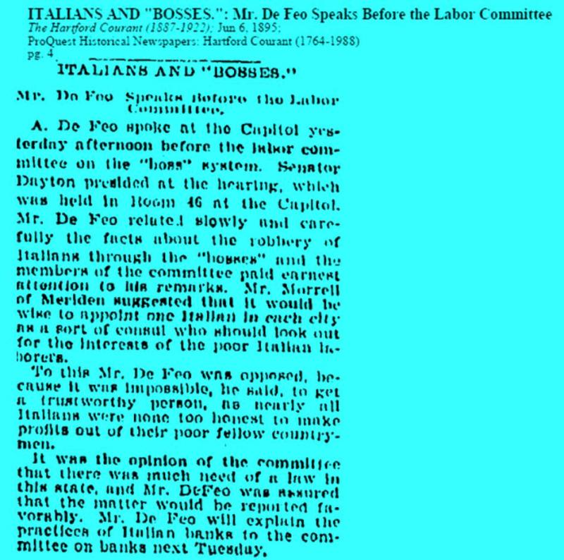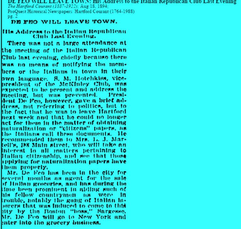 Mr De Feo apparently came to Hartford as the representative of a chain selling groceries to other stores. He stayed a few months but became very involved both with the Italian Republicans, of which he became chairman, as well as in fighting the Padrone system.