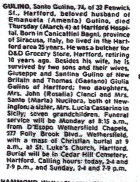 GULINO, Emanuela (Amenta)Emanuela (Amenta) Gulino, 93, of Hartford, beloved wife of the late Santo Gulino, died Saturday, (August 19, 2006) at Hartford Hospital. Born in Canicattini Bagni, province of Siracusa, Italy she was the daughter of the late Gaetano and Maria (Montinieri) Amenta and lived in Hartford for over 50 years. She was a member of the Daughters of Canicattini Bagni. She is survived by two sons and daughters-in-law, Gaetano "Tom" and Giulia Gulino of Hartford, and Giuseppe and Santina Gulino of New Britain; her daughter, Rosalia Cianci of Newington; seven grandchildren, Emanuela Rheaume and her husband, Bruce, Santo Gulino and his wife, Gia, Concetta Carducci and her husband, Wayne, Vanessa Gulino, Anthony Cianci and his wife, Karen, Lucy Massaro and her husband, Jon, and Giuseppe Nucifora and his wife, Lucy; fifteen great grandchildren; a brother and sister-in-law, Giuseppe and Bice Amenta and a sister-in-law, Giuseppina Amenta all in Italy. Besides her husband she was predeceased by her daughter, Maria Nucifora; two sons-in-law, Santo Nucifora and Giovanni Cianci; a brother, Paolo Amenta; and a sister, Lucia Russo. The family would like to express their sincerest gratitude to her long time caregiver, Kristina. The funeral is Wednesday at 9 a.m. from the D'Esopo Funeral Chapel, 277 Folly Brook Blvd., Wethersfield with a Mass of Christian Burial at 10 a.m. in St. Luke's Church, Hartford. Burial will be in Cedar Hill Cemetery, Hartford.