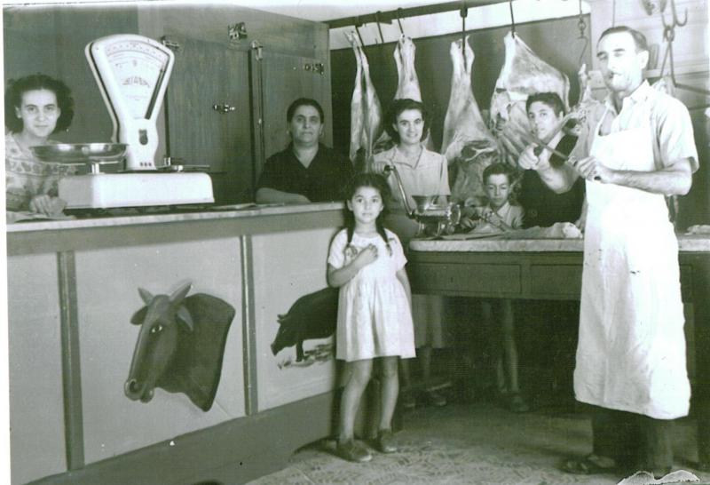 1952, La famosa macelleria "pitichinu" di Canicattini. Da sinistra a destra: Maria Gulino; Emanuela Gulino; la piccola Lia Rita Cassarino; Rosalia Gulino; Gaetano Gulino; Lucietta Cassarino ( sorella di Santo) e Santo Gulino. Assente Giuseppe Gulino.